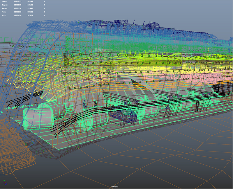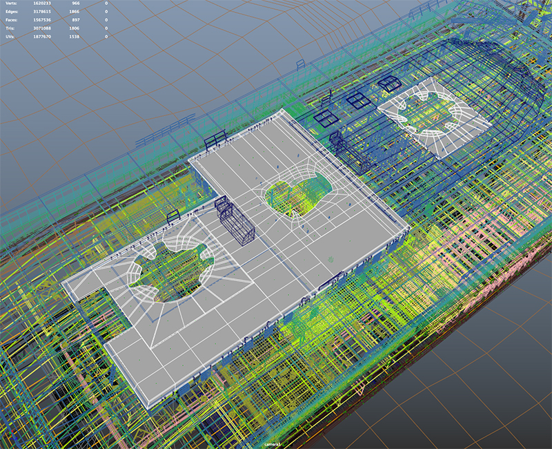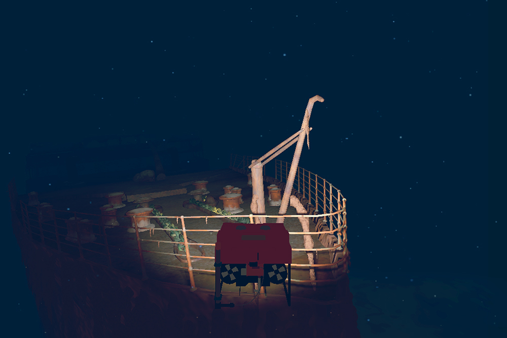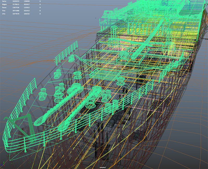 The older models needed some updating in Maya software as well as optimized since they would now be rendered in the real time Unity game engine. Since the user would now be controlling the exploration using a gamer version of the real-life ROV called Robin, paths into the interior and interior deck spaces needed to be created. Texturing was applied using Mudbox, 3D Coat and Substance.