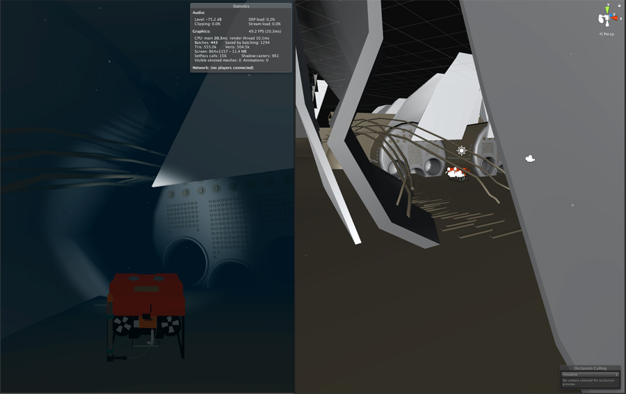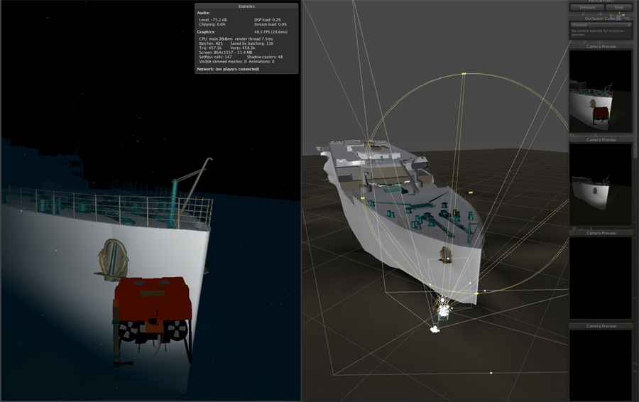 Once the models were complete they were imported into the Unity software where movement and controls were programmed allowwing a standard game controller to be used to steer the little ROV to various destinations. SOme optimization algorithems were needed to limit the amount of geometry the game engine needed to work with and keep frame rates high enough. Fortunately since we were 2-1/2 miles deep, the darkness allowed for only needing the closer geometry seen in the ROV's spotlight to be used at any given point of view.